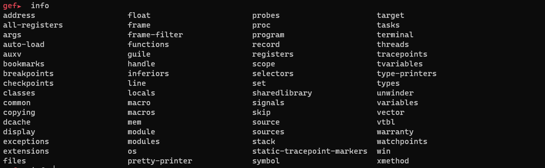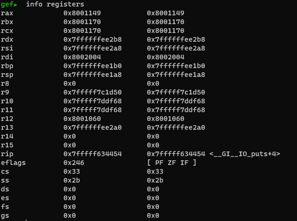 info registers 명령어는 break 명령어로 breakpoint를 걸고 run명령으로 run을 해야 실행할 수 있습니다.