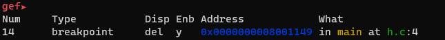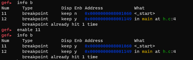 enable 명령어를 사용하면 특정 고유번호를 가진 비활성화된 breakpoint를 활성화 할 수 있습니다.