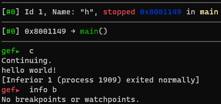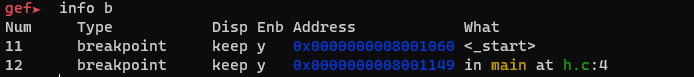info b를 사용하면 지금까지 걸린 breakpoint 리스트를 볼 수 있습니다.