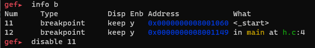 disable 명령어를 통해 특정 고유번호를 가진 breakpoint를 비활성화 할 수 있습니다.