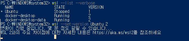 먼저 wsl1을 wsl2로 업그레이드 해보겠다.