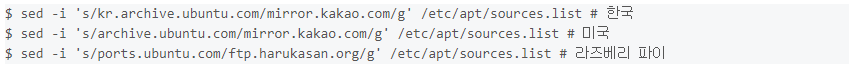 $ sed -i 's/kr.archive.ubuntu.com/mirror.kakao.com/g' /etc/apt/sources.list # 한국